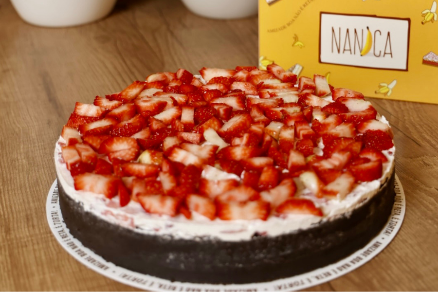 Sabor: massa de bolacha de chocolate, recheio de Nutella, por cima, uma camada leve de chantilly misturada com morango, finalizado com morango picados.